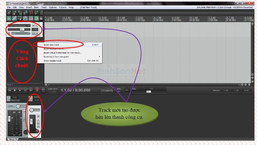 Tạo một track mới để thu âm hoặc dán bài hát bạn bấm tổ hợp phím "Ctrl+T" hoặc click lên phần khoang đỏ chọn "Insert new track":