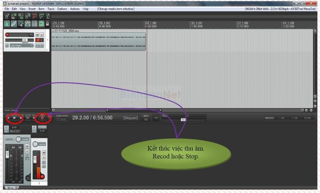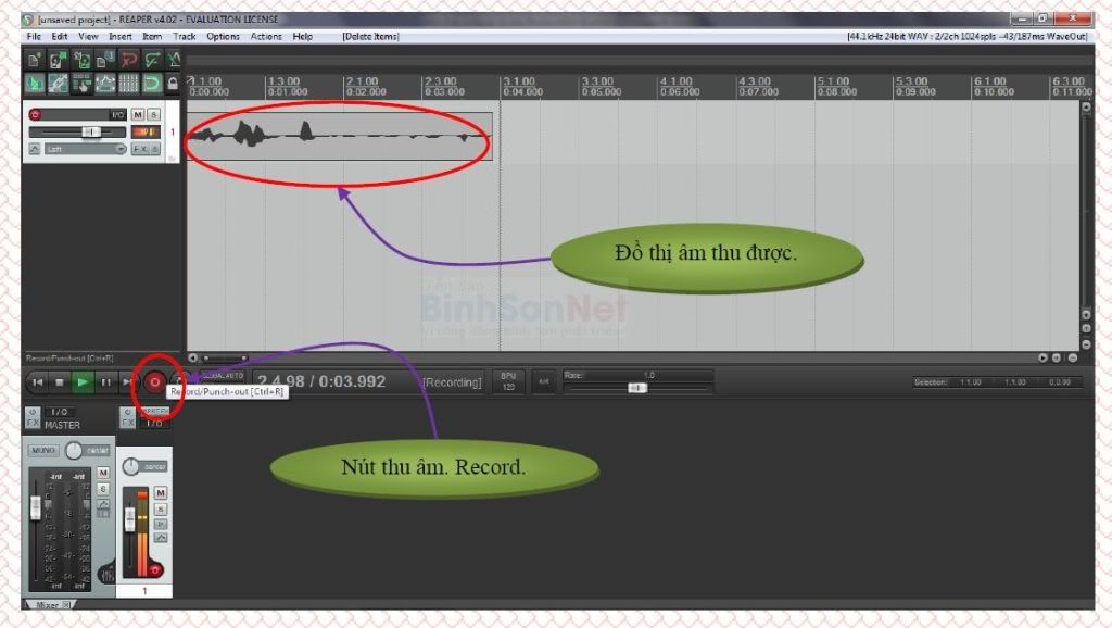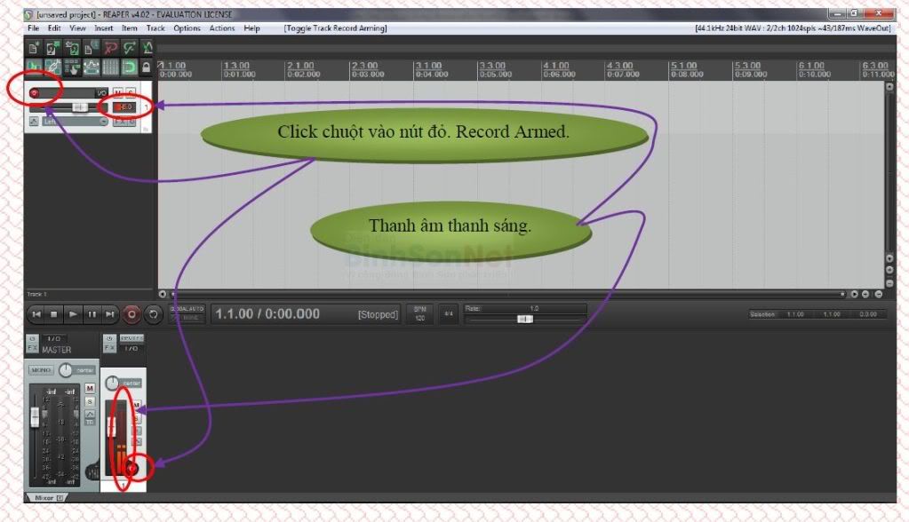 Khi đã tạo một track để thu âm bạn cắm Mic vào máy. Click vào nút đỏ trên thanh track, để Mic thu âm nhận với track đó. Mic nhận thì trên thanh track sáng, thể hiện hiệu ứng âm thanh.