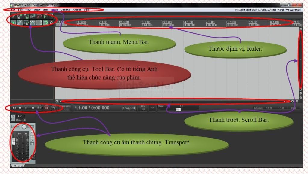 Sau khi Reaper chạy, khung cửa sổ Reaper hiện lên như sau: